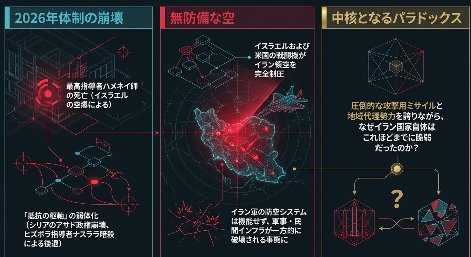 1. 軍事的脆弱性:非対称戦に特化した結果、正規軍を弱体化させ、強大な外敵(米国・イスラエル)に対する基本的な防衛能力を喪失していること。