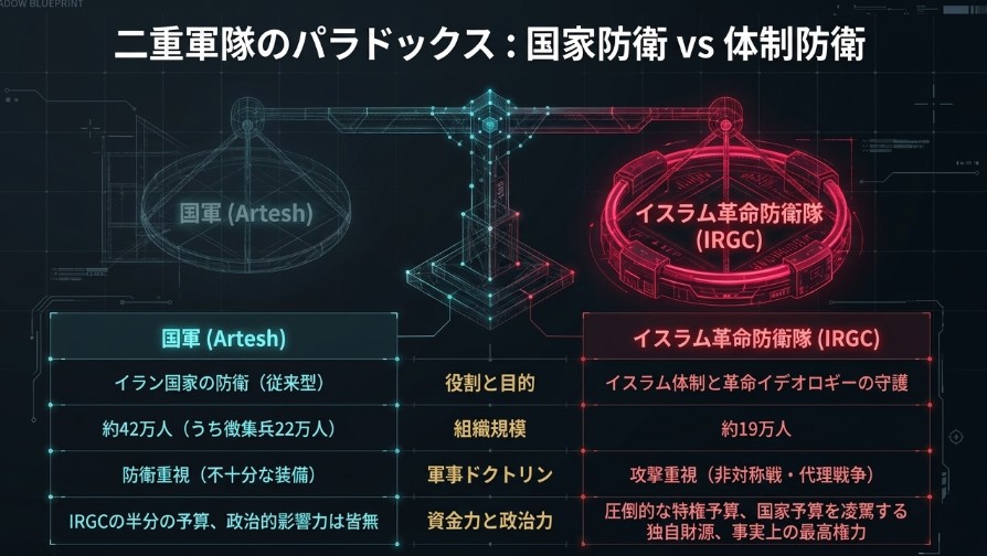 これは、正規軍が国家の主権を守るのに対し、IRGCが「体制の存続」そのものを至上命題とするという、イラン独自の並行軍事構造を生み出した。