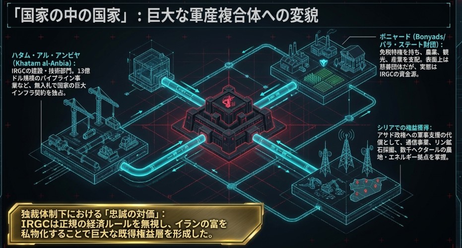 IRGCは単なる軍隊ではなく、国内の建設、エネルギー、通信、金融、農業といった広範なセクターを網羅する、イラン最大の経済アクターである。