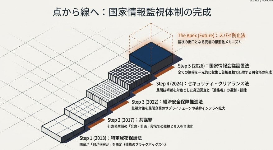 このプロセスは、2013年の特定秘密保護法を基盤とし、2017年の組織的犯罪処罰法改正(共謀罪)、2022年の経済安全保障推進法、2024年の重要経済安保情報の保護及び活用に関する法律(セキュリティ・クリアランス法)、そして2026年に想定される国家情報会議設置法という五つの段階を経て、一つの巨大な「監視の網」を形成しつつある。