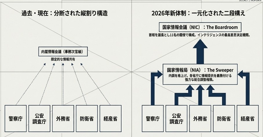 2026年のNIAも、国家安全保障会議(NSC)と密接に連携し、情報の収集から政策決定までを「政治主導」で行うことを目的としている。
